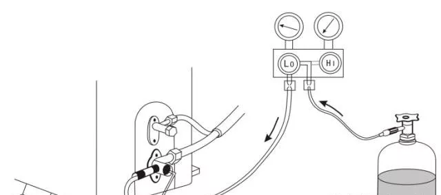4、測溫度。用半導(dǎo)體測溫儀,測量蒸發(fā)器的進(jìn)出口、集液器的出口等各點(diǎn)的溫度,以判斷制冷劑充注量如何。在蒸發(fā)器的進(jìn)口(毛細(xì)管前150mm處)與出口兩點(diǎn)之間的溫差約7--8℃,集液器出口的溫度應(yīng)高于蒸發(fā)器的出口處1-3℃。如果蒸發(fā)器進(jìn)出口的溫差大,表明制冷量充注不足,若吸氣管結(jié)霜段過長或鄰近壓縮機(jī)處有結(jié)霜現(xiàn)象,則表明制冷劑充注過多。