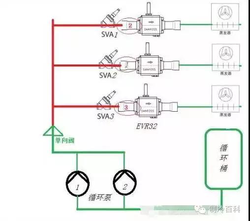 客戶系統(tǒng)圖如下所示,三只電磁閥分別給三間冷庫供液。庫溫降低到設(shè)定溫度,電磁閥切斷供液,庫溫回升,電磁閥開啟供液。中間1號電磁閥為故障閥。
